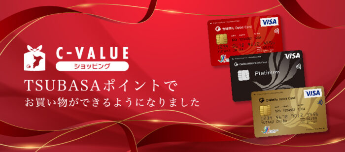 TSUBASAポイントは、千葉銀行の「TSUBASAちばぎんVisaデビットカード」を利用してお買い物をするとたまるポイントです。このポイントは、C-VALUEショッピングで1ポイント=1円としてお使いいただけます。